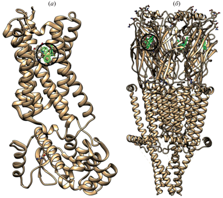 (а) – Пространственная структура мХР М2-типа, установленная методом рентгеноструктурного анализа [5]. В связывающем центре рецептора находится антагонист хинуклидил-3-бензилат (выделен зеленым цветом и окружностью); (б) – пространственная структура нХР типа α7 человека, определенная методом криоэлектронной микроскопии в липидном окружении [9]. В связывающем центре рецептора находится агонист эпибатидин (показан зеленым цветом, в одном из связывающих центров выделен окружностью).