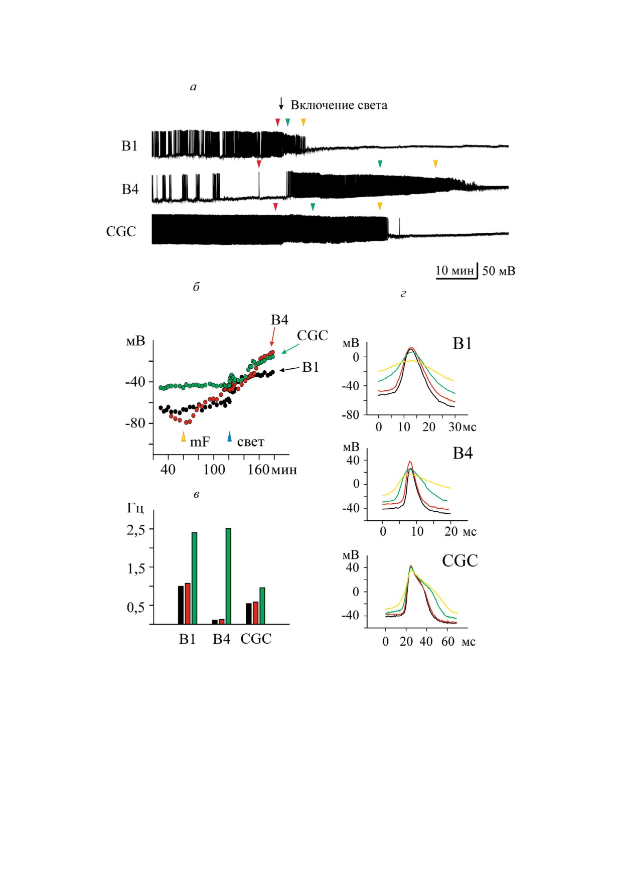 CGC - гигантский церебральный нейрон; B1, B2, B4 - буккальные нейроны; БЛМ - бислойная липидная мембрана;