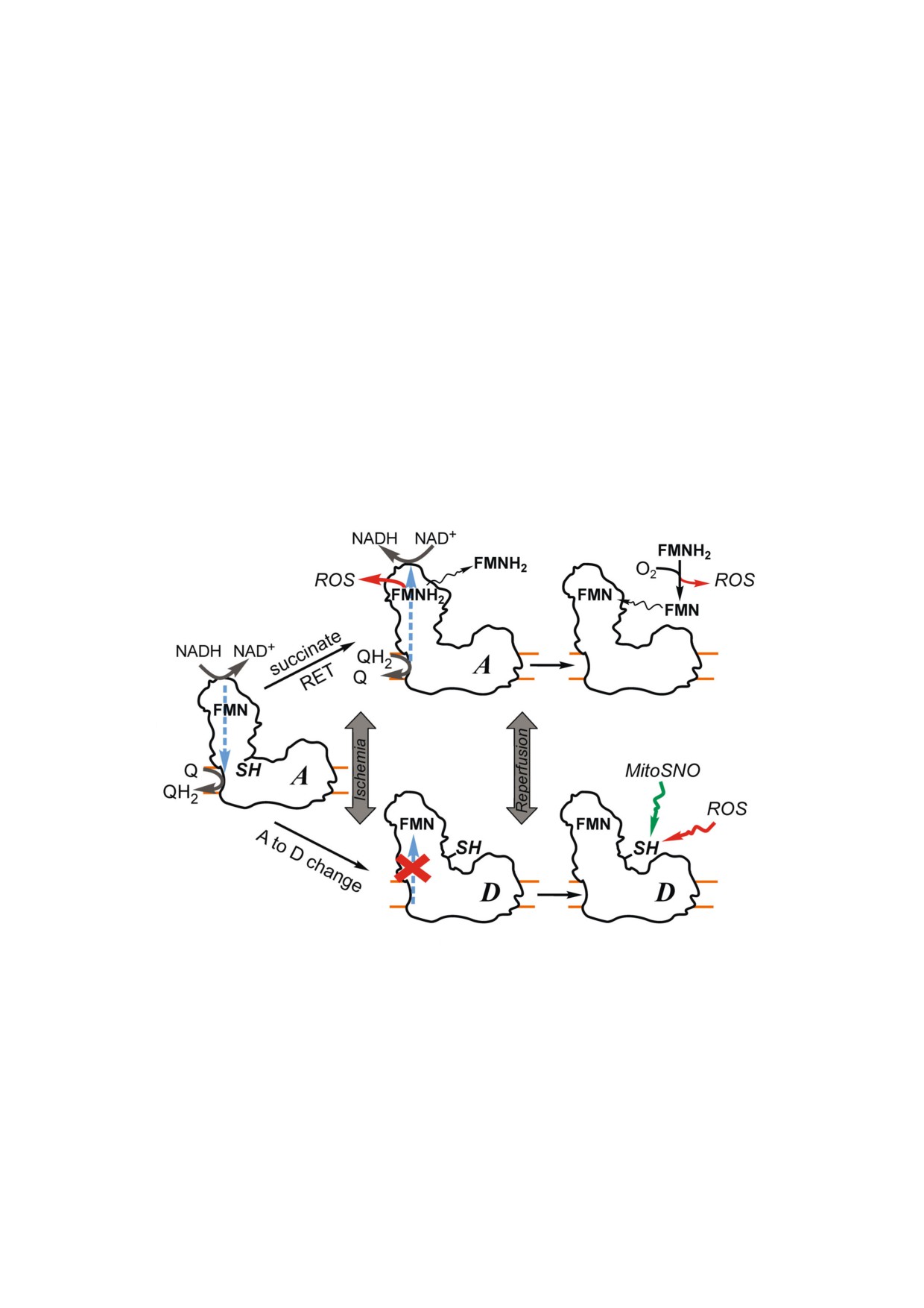 Keywords: stroke, ischemia reperfusion injury, mitochondria, complex I, flavin, thiols, nitrosation