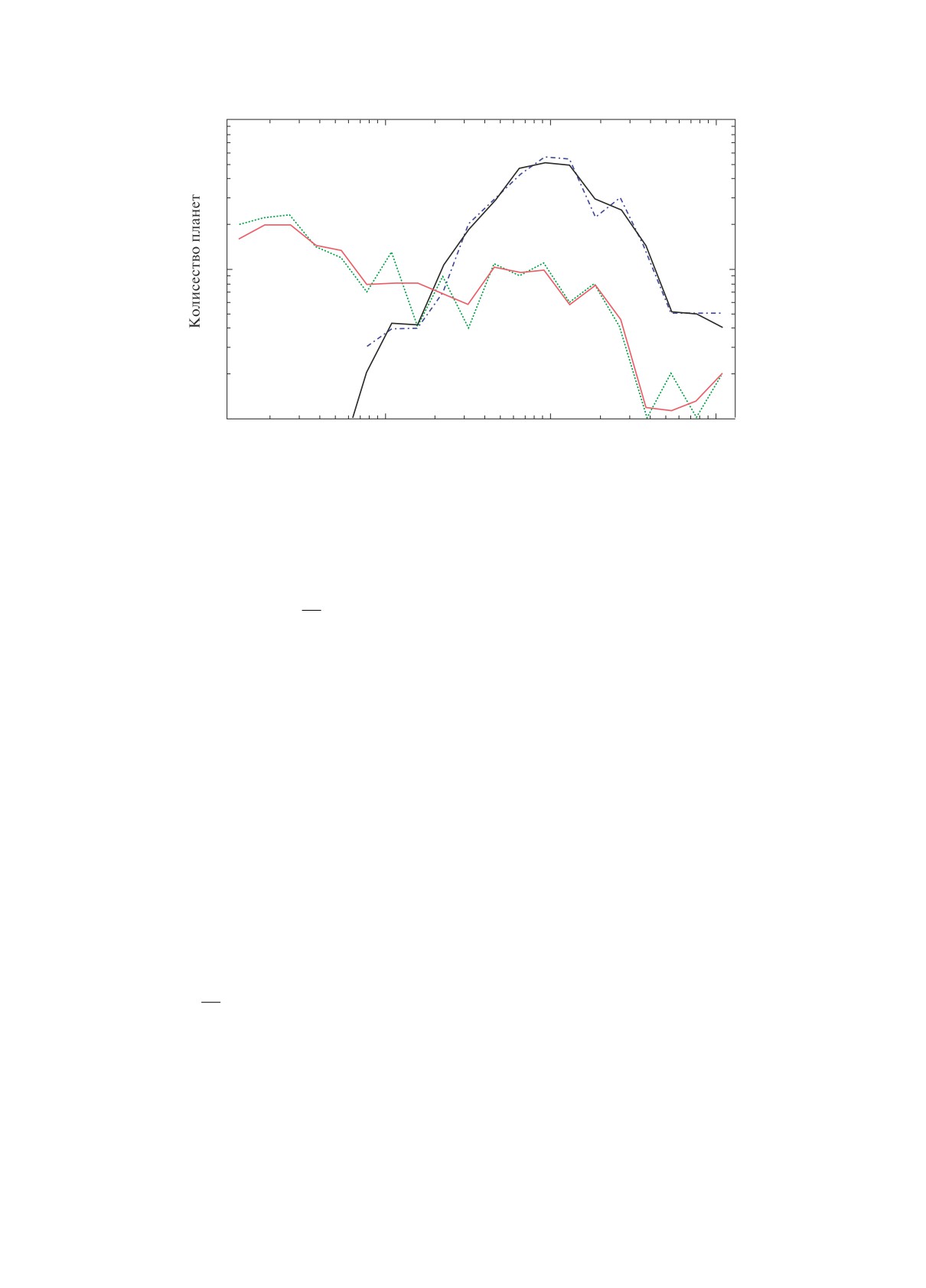 Рис. 1. Точечная линия (зеленая) показывает распределение планет “Кеплера”, с измеренной массой, сплошная линия