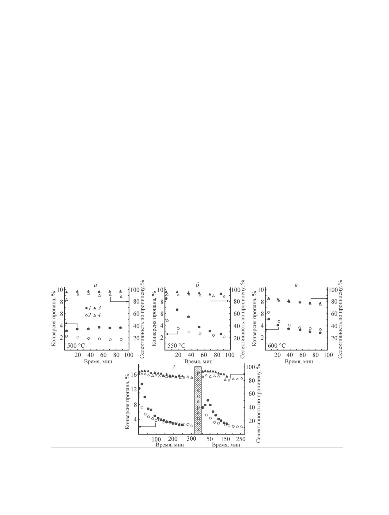 конверсии пропана при 500 и 550°С и высокую скорость дезактивации по сравнению с CrOx-SiO2.
