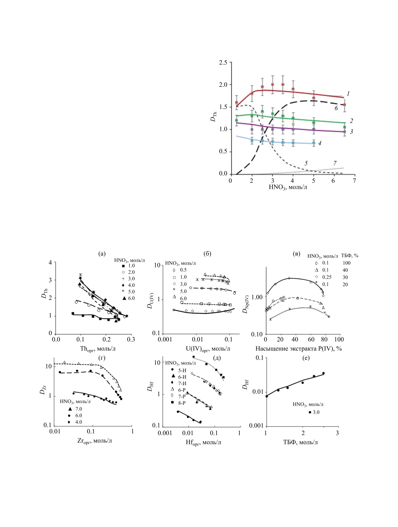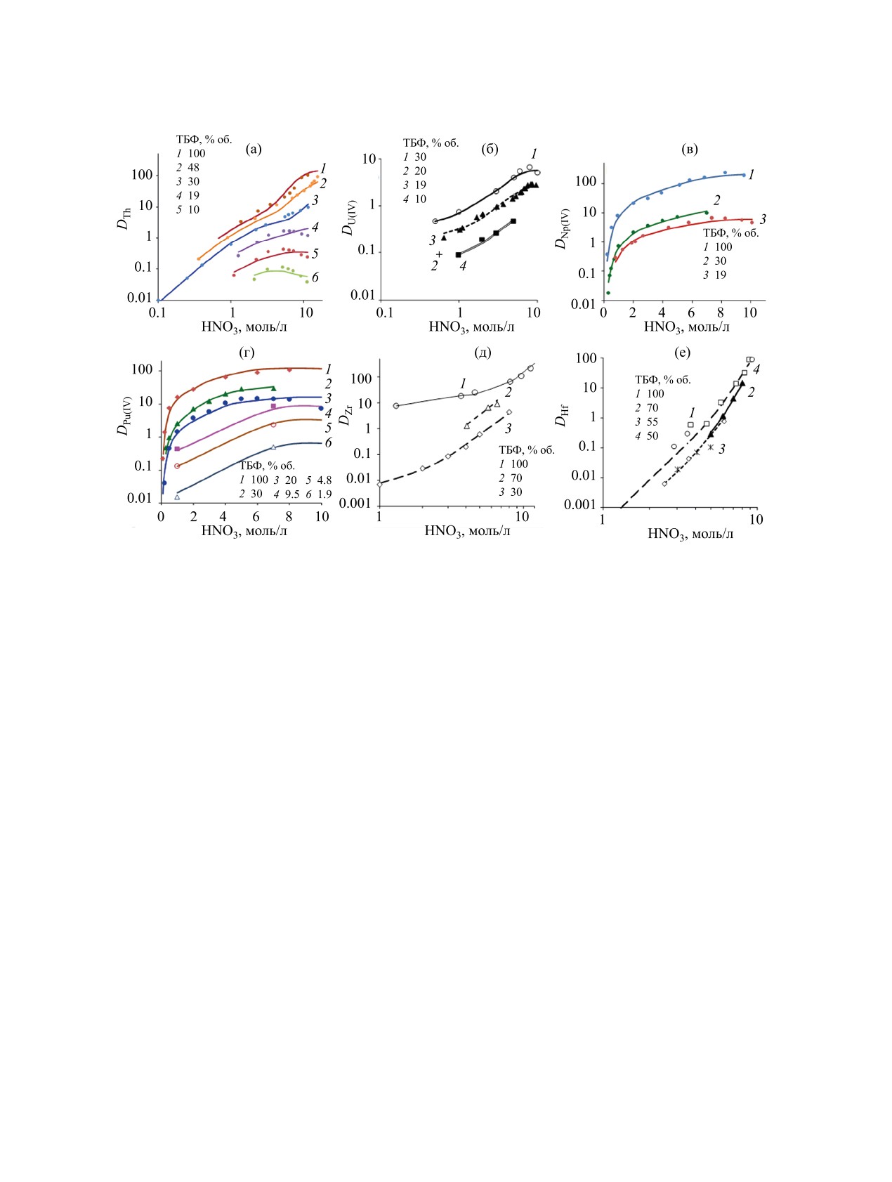 в - Pu(IV) [13], г - Zr, 70% ТБФ, д - Hf, 70%; е - влияние общей концентрации ТБФ на коэффициент распределения Hf [18].