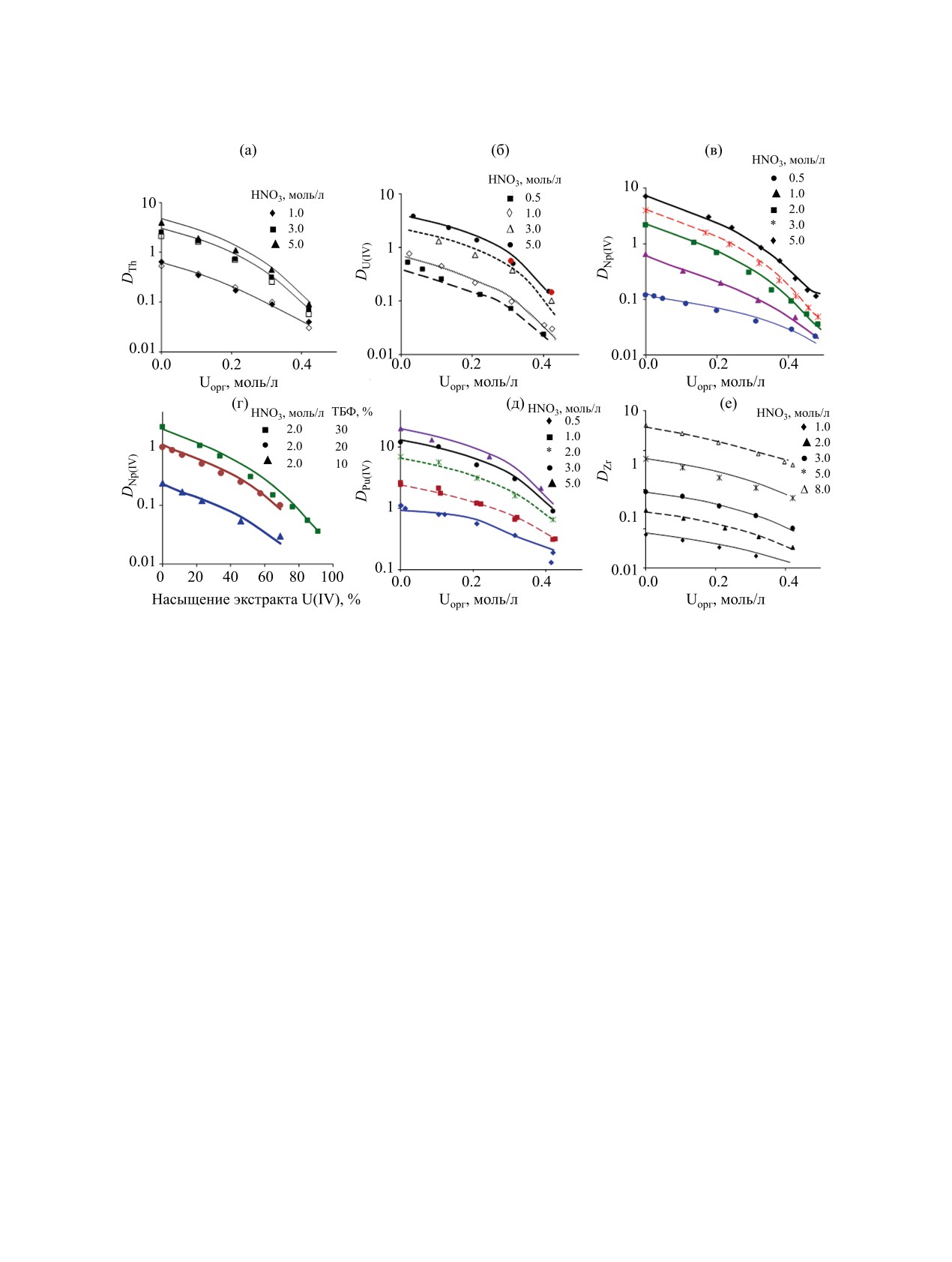 кислотности. а - Th; б - U(IV); в, г - Np(IV); д - Pu(IV); е - Zr.