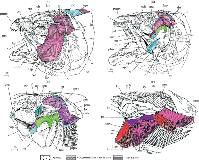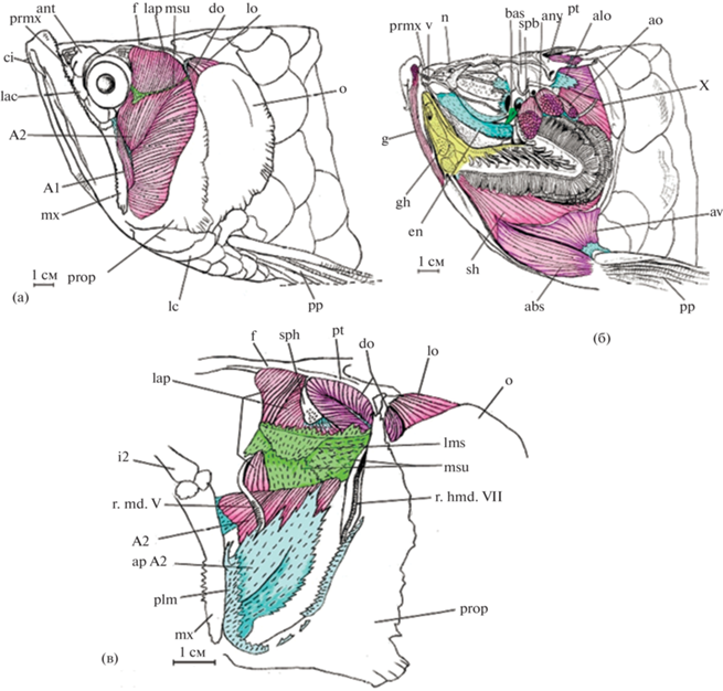 V – m. trigeminus, VII – n. facialis, X – n. vagus, A1 – portio A1 m. adductor mandibulae, A1a + A2 − portio A1a + A2 m. adductor mandibulae, A1б-2 − portio A1б-2 m. adductor mandibulae, A2 – portio A2 m. adductor mandibulae, A2-1 − portio A2-1 m. adductor mandibulae, A2 lat – portio lateralis m. adductor mandibulae, A2 med − portio medialis m. adductor mandibulae, A3 − portio A3 m. adductor mandibulae, aah – fossa hyomandibulare, aap − m. adductor arcus palatini, abs − m. abductor superficialis, ahy – m. adductor hyomandibularis, alo – aponeurosis m. levator operculi, am – m. adductor mandibulae, ant – antorbitale, ao – m. adductor operculi, ap A2 − aponeurosis portio m. adductor mandibulae, apa − aponeurosis palatinus m. adductor arcus palatini, apl – aponeurosis m. levator arcus palatini, apm − aponeurosis maxillaris portio superior m. adductor mandibulae, ar – articulare, av – m. arrector ventralis, bas – pr. basipterygoideus os parasphenoideum, cb 1 – ceratobranchiale 1, cet – cartilago ethmoidale, ci – cirri, cl – cleithrum, com – os coronomeckeli, cp – cartilago palatini, d – dentale, do – m. dilatator operculi, eb 1 – epibranchiale 1, ec – ectopterygoideum, eh − m. pharyngo-hyomandibularis, en – entopterygoideum, ep – epioticum, epx – m. epaxialis, eth – ectoethmoideum, exs – extrascapulare, f – frontale, g – m. geniohyoideus, gh – basihyale, hm – hyomandibulare, hy – hyoideum, hyin – m. hyohyoideus interioris, i2 – infraorbitale 2, ih – interhyale, int – m. intraoperculi, io – interoperculum, lac – lacrimale, lap – m. levator arcus palatini, lat – lateroshenoideum, lc – lobus coriaceus os interoperculum, le 1 – m. levator branchialis 1, lep – lig. palato-ethmoidale, lig – ligamentum, lio – lig. interoperculare, lms – lingua membrana suspensoria, lo – m. levator operculi, mes – mesethmoideum, mhyo – mm. hyohyoidei, msu – membrana suspensoria, mt – metapterygoideum, mx – maxillare, n – nasale, o – operculum, ob – orbitosphenoideum, or – orbitale, pal – palatinum, par – parashenoideum, pev – premaxilloethmovomer, plm – pars lateralis aponeurosis maxillaris m. adductor mandibulae, pp – pinna pectoralis, pr – prooticum, prmx – praemaxillare, prop – praeoperculum, pt – pteroticum, ptm – posttemporale, q – quadratum, r. hmd. VII – ramus hyomandibularis VII, r. md. V – ramus mandibularis V, scl – supracleithrum, sep – septum textus conjunctivus, sh – m. sternohyoideus, sho – septum horizontale, so – suboperculum, sph – sphenoticum, spmx – supramaxillare, sy – symplecticum, ten – tendo, ten A3 – tendo portio A3 m. adductor mandibulae, tpo – textus organum palatinum, v – vomer.