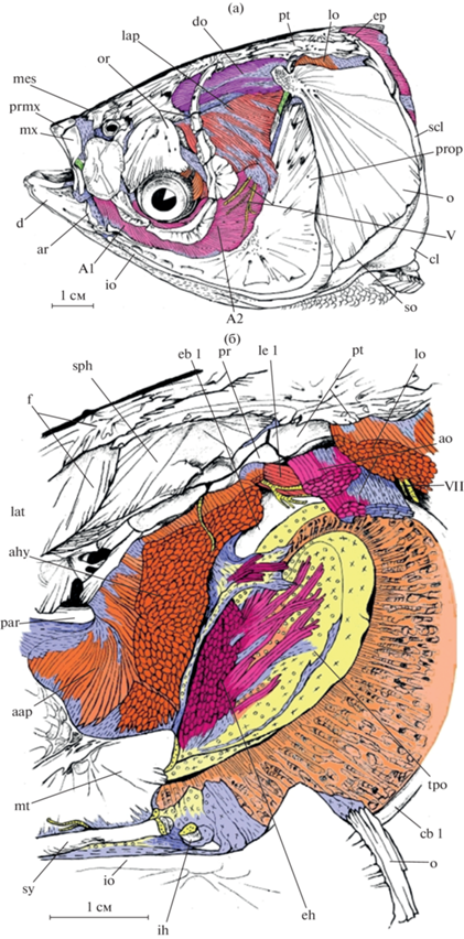В работе использованы сокращения: ААР – m. adductor arcus palatini, AD HYO – m. adductor hyomandibularis, АМ – m. adductor mandibulae, AO – m. adductor operculi, DO – m. dilatator operculi, EP – m. epaxialis, GH – m. geniohyoideus, HYX – m. hypaxialis, LAP – m. levator arcus palatini, lig. – связка (ligamentum), LO – m. levator operculi, m. – мускул (musculus), pr. – отросток (processus) и SH – m. sternohyoideus.