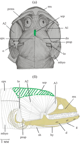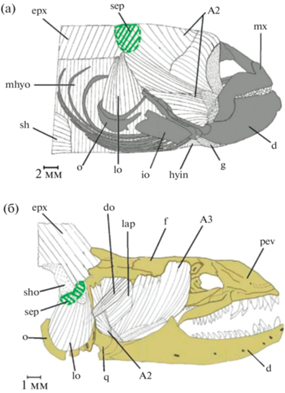 Интересны примеры последовательного соединения висцеральных и соматических по происхождению мускулов Teleostei. Разросшийся АМ рыб может контактировать с позади расположенной ЕР посредством сухожильных промежутков, что служит приспособлением для увеличения способности рыться в грунте головой вперед. Подобная морфологическая адаптация характерна для многих Anguilliformes (De Schepper et al., 2005; Eagderi, 2010), например для рисового угря Piso-donophis boro и угря-спагетти Moringua edwardsi (см. De Schepper et al., 2007). Подобное поведение использует курносый угорь Simenchelys parasitica при проникновении в тушу мертвой жертвы или в тело животного-хозяина. Контакт двух мышц увеличивает производительность работы обеих, создавая вариант системы многопорционного сверхмускула, сочетающего компоненты висцерального (АМ) и соматического (ЕР) происхождения (рис. 7а). При этом совместная активность ЕР и АМ помогает рыбе выполнять движения головы вверх и назад, а также более прочно фиксировать нижнюю челюсть. Силовое приведение dentale необходимо угреобразным для поддержания целостности челюстного сустава, поскольку нагрузка, возникающая при встрече с грунтом или тканями жертвы, ориентирована назад и стремится разъединить суставные поверхности. Таким образом, единовременное сокращение АМ и ЕР позволяет этим животным поднимать голову с плотно закрытой нижней челюстью, осуществляя эффективное проникновение в толщу субстрата или тело добычи (Eagderi, 2010; Eagderi et al., 2016). У мурены Gymnothorax prasinus разросшийся LO берет начало с ЕР и передней части septum horizontale (рис. 7б) (Eagderi, 2010). Возможная причина этого в сильном разрастании у данного вида АМ, приводящем к смещению в каудальном направлении областей прикрепления части висцеральных мускулов.