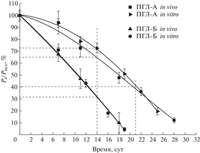 Как следует из рис. 1, кривые снижения прочности нитей ПГЛ-Б in vivo и in vitro совпадают полностью, у нитей ПГЛ-А ‒ в пределах доверительных интервалов, поэтому для нитей каждого из производителей были построены обобщенные графики изменения прочностных характеристик in vivo и in vitro (рис. 2), описываемые полиномом 2-й степени и уравнениями регрессии (1) и (2):