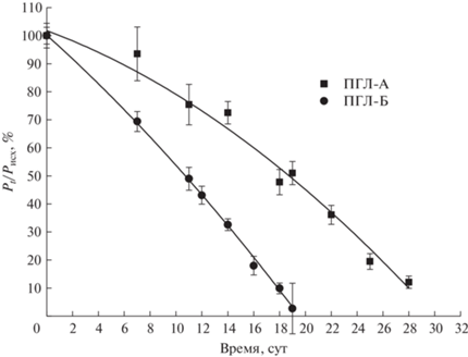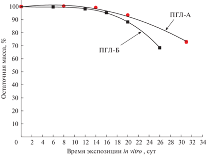 Изменение массы образцов нитей ПГЛ-А и ПГЛ-Б в зависимости от времени экспозиции in vitro. Fig. 4. Change in mass of PGL-A and PGL-B samples of suture materials depending on the exposure time in vitro