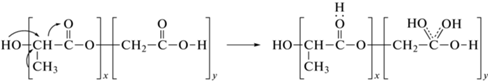 Схема I . Внутримолекулярное превращение кетогруппы эфирной связи при биодеструкции сополимера гликолида с лактидом. Scheme I . Intramolecular transformation of the keto group of the ester bond during the biodegradation of the copolymer of glycolide with lactide.