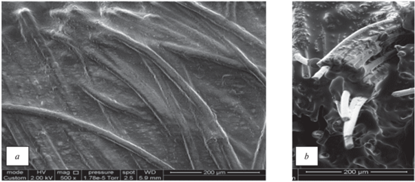 Электронная микрофотография шовного материала ПГЛ-А через 28 сут. экспозиции in vivo, увеличение: 500×. a ‒ нить в соединительнотканной капсуле; b ‒ элементарные нити, окруженные соединительной тканью. Fig. 3. Electron micrograph of PGL-A suture material after 28 days of exposure in vivo, magnification: 500×. a ‒ thread in the connective tissue capsule; b ‒ filaments surrounded by connective tissue.