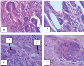 Гистологические срезы образцов биологических тканей после имплантации ПГЛ нитей. Окраска: гематоксилин и эозин, ×630. a ‒ 7 сутки экспозиции in vivo. Гигантские клетки Пирогова-Лангханса в капсуле вокруг нити; b ‒ 14 сутки экспозиции in vivo. Продольный срез элементарных нитей, гигантские клетки Пирогова-Лангханса в капсуле вокруг нити; c ‒ 25 сутки экспозиции in vivo. Соединительнотканная капсула: 1 ‒ активная гигантская клетка Пирогова-Лангханса; 2 ‒ гигантская клетка Пирогова-Лангханса в стадии разрушения, содержит частицу элементарной нити; d ‒ 40 сутки экспозиции in vivo. Клетка Пирогова-Лангханса с частицей нити. Fig. 5. Histological sections of biological tissue samples after implantation of PGL threads. Staining: hematoxylin and eosin, ×630. a ‒ 7 days of exposure in vivo. Giant Pirogov-Langhans cells in a capsule around the thread; b ‒ 14 days of exposure in vivo. Longitudinal section of elementary filaments, giant Pirogov-Langhans cells in a capsule around the filament, c ‒ 25 days of exposure in vivo. Connective tissue capsule: 1 ‒ Pirogov-Langhans active giant cell; 2 ‒ Pirogov-Langhans giant cell in the stage of destruction, contains a particle of elementary filament; d ‒ 40 days of exposure in vivo. Pirogov-Langhans cell with a thread particle.