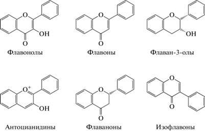 В этой связи вполне логичен большой интерес, который проявляют в последнее время к флавоноидам. Флавоноиды ‒ вторичные метаболиты растений, общая химическая структура которых представлена на рис. 1 . Для некоторых соединений, входящих в состав основных групп флавоноидов (рис. 2 ), уже известна терапевтическая эффективность в отношении ряда заболеваний и их благоприятное воздействие на течение COVID-19. Многочисленные исследования позволили выявить у флавоноидов выраженную противовоспалительную, антиоксидантную, иммуномодулирующую, антикоагулянтную активность [2‒4]. Особенно интригующим выглядят сведения относительно противовирусного действия флавоноидов, обнаруженного при различных вирусных заболеваниях, в том числе при COVID-19, осложнененном цитокиновым штормом и тяжелым острым респираторным дистресс-синдромом (ОРДС) [5‒15]. Хотя противовирусный эффект большинства флавоноидов в отношения SARS-CoV-2 пока не подтвержден клиническими исследованиями, а их предсказанная эффективность базируется в основном на результатах молекулярного докинга и моделирования, а также экспериментов in vitro, применение флавоноидов в комплексном лечении COVID-19 весьма перспективно.