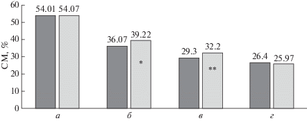 Процентная представленность α-ритма по отношению ко всему исследуемому частотному диапазону. * – достоверные различия (p(t) < 0.001); ** – p(t) < 0.01. Остальные обозначения см. рис. 2.