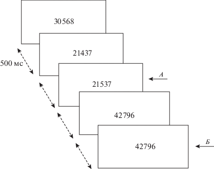 Пример последовательности стимулов в тесте CPT-IMT. А – стимул-ловушка, отличается от предыдущего стимула на одну цифру; Б – целевой стимул, идентичен предыдущему. Длительность предъявления стимулов 500 мс, межстимульный интервал – 500 мс.