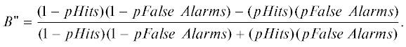 $A{\kern 1pt} ' = \frac{{{1 \mathord{\left/ {\vphantom {1 2}} \right. \kern-0em} 2} + \left( {pHits - pFalse{\text{ }}Alarms} \right)\left( {1 + pHits - pFalse{\text{ }}Alarms} \right)}}{{4[pHits(1 - pFalse\,\,Alarms)]}},$Показатель B " отражает критерий стратегии выполнения теста, возникающей в процессе принятия решения. Либеральная стратегия проявляется в большом числе реакций на нецелевые стимулы (ложные тревоги) в попытке среагировать на большее число целевых, в то время как консервативная стратегия выражается в тенденции пропускать целевые стимулы в попытке избежать ошибочных реакций на нецелевые стимулы и увеличивая, таким образом, количество ошибок-пропусков. Величина параметра B " лежит в пределах от –1 до 1. Значения ниже нуля указывают на либеральную стратегию, а выше нуля – на консервативную. Формула вычисления показателя сенсорной стратегии B " [15]: