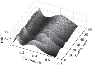 Динамика спектра индекса фазовой синхронизации (ИФС) во время упражнения с синусоидально изменяющейся нагрузкой. Спектры ИФС рассчитаны для последовательных 4‑мин интервалов, перекрывающихся на 3 мин, и усреднены по группе из 8 чел.