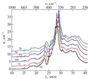 На рис. 1 приведена спектральная зависимость коэффициента поглощения (ослабления) природного германия (natGe) и пяти моноизотопных образцов германия в диапазоне 10–40 мкм. Характер каждого спектра примерно одинаков, наблюдается незначительная разница в величине коэффициента поглощения. Для более наглядной визуализации специфического характера спектров кривые сдвинуты вверх путем коррекции значений коэффициента ослабления (изотоп 70Ge – без коррекции, 72Ge – коррекция +2 см–1, природный германий +5 см–1, изотопы 73Ge + 8 см–1, 74Ge + 10 см–1, 76Ge +12 см–1). Основное отличие заключается в соответствии полос поглощения соответствующей длине волны (частоте); наглядно видно, что изотопический состав кристаллов влияет на положение характерных полос поглощения Ge в рассматриваемом спектральном диапазоне. В спектральном диапазоне 11–40 мкм нами выявлено 16 полос поглощения, что соответствует данным работ [13, 14, 22]; для изотопа 70Ge положение ряда характерных полос было выявлено впервые.