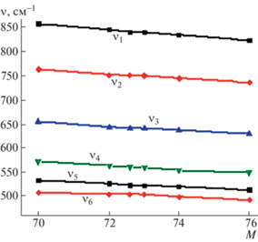 где ν0 – частота максимума соответствующей полосы фононного поглощения природного германия; М – массовое число изотопа; k – степенной коэффициент, находящийся в диапазоне 0.0062–0.0072.Результаты настоящего эксперимента показали (табл. 2), что решеточные пики поглощения для первых 6 полос (табл. 1), наблюдаемые в монокристаллах германия природного изотопического состава, в образцах моноизотопных кристаллов германия (70Ge, 72Ge, 73Ge, 74Ge, 76Ge) сдвигаются в соответствии с зависимостью (1). Результат наглядно проиллюстрирован на рис. 2 на частотах для первых шести полос: зависимости частот ν пиков фононного поглощения этих кристаллов от М – массового числа изотопа.
