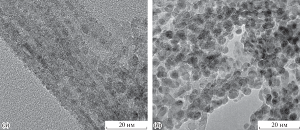 Типичные микрофотографии ПЭМ-образцов Pd / A и Pd / Z приведены на рис. 1. На сером фоне видны более темные области – это наночастицы, которые, согласно ЭДА, можно отнести к Pd-содержащим частицам. Представленные изображения свидетельствуют о равномерном и практически полном заполнении поверхности носителя наночастицами палладия размером около 2 нм. Средний размер частиц Pd в аналогичных образцах Pd / ZSM-5, по данным [34], равен 1.7 нм. Высокая дисперсность частиц, их узкое распределение по размерам и гранулированный характер покрытий, формируемых ЛЭД, являются характерными особенностями метода независимо от металла, носителя и степени заполнения его поверхности [27].