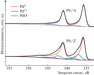 В обзорных РФЭ-спектрах образцов Pd / A и Pd / Z наблюдали линии кислорода, палладия, алюминия, кремния (для цеолита) и углерода. На рис. 2 приведены соответствующие Pd3d-спектры и показано разложение спектров Pd3d5/2 на три компоненты, выполненное, как описано в работе [34], с использованием данных [40]. Доли атомов Pd в различных электронных состояниях – Pd0, PdO и Pd2+ – в составе Pd(OH)2 или в форме катионов, связанных с кислородом носителя, приведены в табл. 2 вместе с энергиями связи соответствующих компонент. Из сравнения этих данных для образца Pd / Z с полученными ранее результатами для Pd-модифицированных цеолитов ZSM-5 с отношением Si / Al, равным 15 (как в настоящей работе) и 27.5, также синтезированных методом ЛЭД, можно сделать следующий важный вывод: повышение содержания Pd от 0.02 до 0.03 мас. % мало отражается на параметрах спектра и, соответственно, на состоянии палладия на поверхности цеолита при соотношении Si / Al = 15. В то же время повышение силикатного модуля цеолита в образце с аналогичным данной работе содержанием Pd 0.03 мас. % резко увеличивает долю Pd0 до 95%.