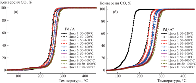 По данным [39], выбранное в работе содержание палладия 0.21 мас. % в образце сравнения Pd / A* должно обеспечивать высокую конверсию СО. Как видно из рис. 3б, начальная активность на нем действительно выше, чем для образца Pd / A. Однако уже во втором цикле при температуре 320°C температурная зависимость смещается примерно на 80°C в высокотемпературную область. Температуры 50% конверсии (см. табл. 3) становятся сопоставимы со значениями, полученными для образца Pd / A со значительно меньшим содержанием палладия. Следующие стадии дезактивации катализатора Pd / A* наблюдаются после нагрева образца до 600 и 800°C соответственно. Суммарное смещение температурной зависимости между первым и одиннадцатым циклами составило 118°C, что значительно больше значения для образца Pd / A и обусловлено более сильной дезактивацией пропиточного катализатора при взаимодействии с реакционной смесью. Быстрая дезактивация высокодисперсных палладиевых катализаторов на основе оксида алюминия, приготовленных традиционными методами, происходит в результате миграции кластеров и наночастиц палладия и их последующего спекания при повышении температуры свыше 600°C [39].