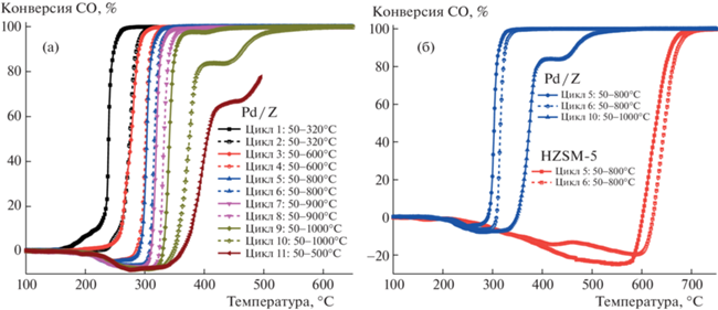 Катализатор Pd / Z демонстрирует более высокую начальную активность, по сравнению с образцом Pd / A (табл. 3). Однако в последующих циклах наблюдается интенсивная дезактивация катализатора, а начиная с четвертого цикла, окислению CO предшествует увеличение его концентрации (рис. 4а). Аналогичную картину ранее наблюдали в условиях ФТС для цеолитов, модифицированных железом и серебром [41, 42]. Цеолиты, как известно, способны выступать в качестве ловушек для углеводородов, причем их адсорбционная емкость может быть существенно увеличена за счет модифицирования сорбционных центров ионами или наночастицами металлов. Наблюдаемое ухудшение активности во втором и третьем циклах указывает на миграцию частиц палладия по поверхности цеолита и частичный их уход внутрь порового пространства. Палладий в каналах цеолита локализуется вблизи кислотных центров и модифицирует их, тем самым повышая сорбционную емкость по отношению к углеводородам. Этим объясняются появление сорбционного эффекта в последующих циклах и снижение активности в окислении CO, поскольку концентрация палладия на внешней поверхности цеолита уменьшилась. Нагрев образца до 600°C в конце третьего цикла приводит к отклонению кривой четвертого цикла в область отрицательных значений конверсии, что свидетельствует о выделении CO. Источником CO служат углеводороды (пропилен, толуол), адсорбированные на цеолите и претерпевающие неполное окисление при температурах 250–350°C. Данный факт указывает на то, что уже при 600°C начинается взаимодействие нанесенного палладия с цеолитом, приводящее к модификации сорбционных центров. Для подтверждения данного заключения на рис. 4б сопоставлены температурные зависимости конверсии CO на катализаторе Pd / Z и исходном цеолите. Видно, что в отсутствие палладия количество выделяемого CO в интервале 250–350°C за счет неполного окисления адсорбированных углеводородов значительно ниже. Сорбционный эффект для чистого цеолита существенно смещен в область более высоких температур.
