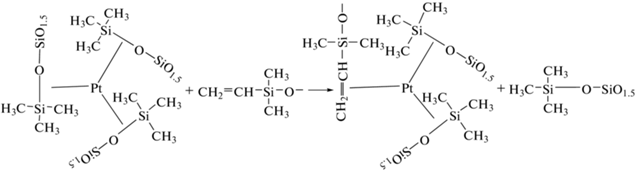 В работе [14] показано, что коллоидная платина в виде кристаллитов платины диаметром 1–5 нм образуется в результате реакций КК с группами ≡SiH в реакции гидросилилирования, при этом стадия восстановления Pt(II) до Pt(0) является обычно периодом индукции.