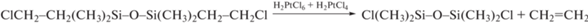 Хлористый водород, образующийся в результате гидролиза H2PtCl6, гидрохлорирует винильные группы в дисилоксане с образованием хлорэтильных групп по уравнению (4), которые в свою очередь в данных условиях реакции разлагаются с образованием этилена и 1,3-дихлортетраметилдисилоксана по схеме (5). Поучаствовав в ряде вышеуказанных процессов, HCl выделяется по уравнению (6) и делает возможной реакцию, обратную гидролизу H2PtCl6 по схеме (10).