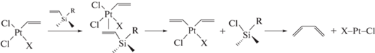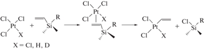 В результате взаимодействия H2PtCl6 · 6H2O с тетраметилдивинилдисилоксаном в мольном соотношении 1 : 1 в течение 4.5 ч образуются диметилциклосилоксаны (29Si ЯМР δ = –19…–22 м. д.) и выпадает осадок. По данным спектроскопии 1Н ЯМР интенсивность сигналов резонансов групп СН=СН2 (δ = 5.9 м. д.) в 13 раз ниже, по сравнению с данными для исходного [(CH3)4(CH2=CH2)2Si]2O. Убывание количества винильных групп возможно по реакциям (4) и (5) либо в результате реакций обмена (8) и (9) [7]: