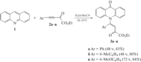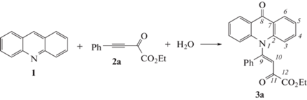 Реакция акридина 1 с этиловыми эфирами арил-2-оксобут-3-иновых кислот 2а–в и водой. К раствору акридина 1 (0.50 ммоль, 89 мг) и ацетилена 2 (0.75 ммоль) в MeCN (0.5 мл), в атмосфере воздуха добавляли Н2О (27.5 ммоль, 495 мг). Полученную смесь перемешивали при 20–25°C в течение 48–72 ч. Растворитель упаривали при пониженном давлении, остаток очищали методом колоночной хроматографии на SiO2, элюент – хлороформ : этанол (объемное соотношение 20 : 1). Выделяли вязкий остаток, который сушили при пониженном давлении.