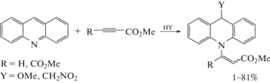 Акридиновые и акридоновые структуры входят в молекулы большого числа биологически активных соединений, в том числе и природного происхождения (алкалоидов), проявляющих широкий спектр различных активностей, таких как противораковая, антилейкемическая, анальгетическая, антиоксидантная, противовоспалительная, противомалярийная, противогрибковая и др. (например, см. обзоры [1–3]). Поэтому разработка синтетических методов к синтезу, функционализации и модификации акридина является актуальным направлением в гетероциклической химии, ориентированной на поиск новых кандидатов в лекарства. Электронодефицитные ацетилены давно зарекомендовали себя как удобные реагенты для модификации азинов [4–7]. Однако для акридинов этот подход до сих пор почти не использовался (исключение – две работы Р.М. Ачесона (R.M. Acheson) и соавт. 1954 г. [8] и 1975 г. [9], где акридины изучались наряду с широким рядом других азинов). Наиболее часто в качестве электронодефицитных ацетиленов для функционализации пиридинов и его бензоаналогов используют алкиловые эфиры ацетиленкарбоновых кислот и ацилацетилены, при этом функционализация во всех случаях начиналась с образования цвиттер-ионов – 1,3(4)-диполярных комплексов. Алкиловые эфиры 2-оксобут-3-иновых кислот в этом аспекте представляют большой интерес, поскольку комбинация сопряженных карбонильной и сложноэфирной групп должна сильнее активировать тройную связь исходного ацетилена и открывать возможность новых направлений реакций цвиттер-ионов.