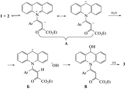 По-видимому, сборка молекулы продукта 3 – дважды функционализированного акридина – начинается с генерирования цвиттер-иона А – аддукта нуклеофильной атаки атома азота акридина 1 на тройную связь ацетилена 2 (схема 4). Карбанионный винильный центр интермедиата А нейтрализуется протоном от молекулы воды, приводя к интермедиату Б, в котором карбокатионное положение 9 атакуется высвобождающимся гидроксид-анионом. Образующийся N-алкенил-9-гидроксидигидроакридин В оказывается нестабильным и подвергается окислению до N-алкенилакридин-9-она 3. Движущей силой окисления в случае акридиновых производных является стабилизация системы за счет ее дополнительного сопряжения с карбонильной группой.