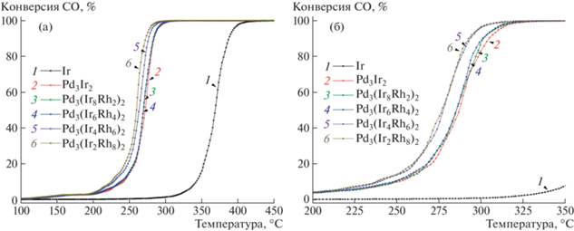 На рис. 4 сопоставлены температурные зависимости конверсии CO в третьем и седьмом каталитических циклах для исследуемых образцов. Цикл III соответствует состоянию катализаторов, подвергнутых низкотемпературному (320°C) воздействию реакционной среды (рис. 4а). Видно, что монометаллический образец сравнения Ir / γ-Al2O3 проявляет значительно более низкую активность при данных реакционных условиях – параметр Т50 составляет 370°C. Активность би- и триметаллических образцов различается не столь существенно – значения Т50 укладываются в интервал 260–272°C. По данному параметру образцы можно расположить в следующий ряд: Ir / γ-Al2O3 (T50 = 370°C) $ \gg $ Pd3Ir2 / γ-Al2O3 (T50 = = 273°C) > Pd3(Ir8Rh2)2 / γ-Al2O3 (T50 = 270°C) ≈ ≈ Pd3(Ir6Rh4)2 / γ-Al2O3 (T50 = 270°C) > > Pd3(Ir4Rh6)2 / γ-Al2O3 (T50 = 263°C) > > Pd3(Ir2Rh8)2 / γ-Al2O3 (T50 = 260°C). Таким образом, наблюдается тенденция снижения каталитической активности по мере увеличения доли иридия в составе катализатора.