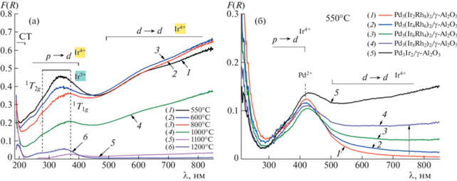 Одними из наиболее информативных методов оценки состояния металлов в составе низкопроцентных трехмаршрутных катализаторов и их термической стабильности являются оптические методы [30]. В частности, метод электронной спектроскопии диффузного отражения позволяет оценить дисперсность металлов и их зарядовое состояние. На рис. 5а представлены спектры монометаллического образца сравнения Ir / γ-Al2O3 после прокаливания на воздухе в интервале температур 550–1200°C. Спектры соответствуют оксидным частицам IrO2 с поглощением на свободных носителях и внутризонными d–d-переходами при длинах волн более 500 нм и межзонными p–d-переходами с уровней p кислорода на d уровни металла при длинах волн короче 413 нм. Эволюция спектров поглощения при увеличении температуры прокаливания, сопровождающаяся быстрым уменьшением интенсивности поглощения IrO2 при температуре 1000°C и выше, указывает на диффузию иридия в объем носителя в виде ионов Ir3+. Об этом свидетельствует наблюдаемый спектр поглощения, характерный для ионов Ir3+ (5d 6), занимающих низкоспиновые октаэдрические позиции в Al2O3, с полосами d–d-переходов 1A1g → 1T1g, 1T2g при 372 и 279 нм. Следует отметить, что при 200 нм можно наблюдать только край полосы переноса заряда. При температуре прокаливания 1200°C в α-Al2O3 происходит небольшое смещение полос d–d-переходов 1T1g, 1T2g в область коротких длин волн, что характерно и для ионов Rh3+ при переходе от низкотемпературных фаз Al2O3 к корунду. По перестройке полосы поглощения в области 250–400 нм можно предположить, что начало процесса диффузии происходит при температуре 800°C. Еще одним отличием от сходных процессов диффузии Rh3+ в объем Al2O3 [30], помимо более высокой температуры начала диффузии, является укрупнение частиц IrO2 при температуре 800°C.