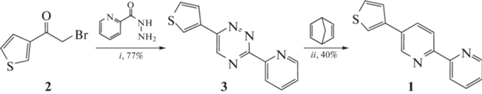 Для синтеза целевых структур мы использовали “1,2,4-триазиновую” методологию [14, 15]. Так, первой стадией синтеза 2,2′-бипиридина 1 с непосредственно связанным с ним 3-тиенильным фрагментом является гетероциклизация 2-бром-1-(тиофен-3-ил)этанона 2 с двумя эквивалентами гидразида пиколиновой кислоты (схема 1). Такой подход к 3,6-дизамещенным 1,2,4-триазинам известен достаточно давно [16]. В данном случае была использована процедура, предполагающая нагрев исходных реагентов в диметилформамиде (ДМФА) в отсутствие дополнительных реагентов [17], что позволяет избежать образования побочных продуктов – дигидразонов арилглиоксаля [18, 19]. Последующая реакция аза-Дильса–Альдера промежуточного триазина 3 с 2,5-норборнадиеном позволила получить С5-тиофензамещенный целевой 2,2′-бипиридин 1. Относительно низкий выход (40%) продукта 1 в данном случае обусловлен необходимостью использования достаточно высококипящего растворителя – 1,2-дихлорбензола вместо о‑ксилола, часто используемого в подобных случаях [20], ввиду заметного электронодонорного характера фрагмента 3‑тиенила.