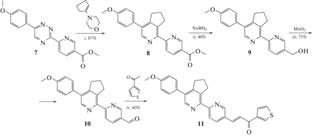 Наконец, в данной работе предложен третий метод получения тиофен-замещенных 2,2′-бипиридинов, который основан на использовании реакции Кневенагеля [23, 24] между натриевой солью 3‑ацетилтиофена, получаемой in situ, и производным 2,2′-бипиридин-5-карбальдегида. Для этого в качестве исходного соединения использовали ранее описанный 3-(5-метоксикарбонилпиридин-2-ил)-1,2,4-триазин 7 [25] (схема 3). Так, реакцией аза-Дильса–Альдера между соединением 7 и 1‑морфолиноциклопентеном получен 2,2′-бипиридин 8. Следует отметить необходимость модификации синтетической процедуры в данном случае по сравнению с соединениями, имеющими сложноэфирную группу в положении С6 остатка 2-пиридила [26]. А именно, для ароматизации нового пиридинового кольца требуется кратковременное нагревание в ледяной уксусной кислоте. Ранее такая процедура применялась, например, при использовании 1,2,4-триазин-5-карбонитрилов в качестве исходных соединений в данной реакции [22]. Последующее восстановление сложноэфирной группы, согласно описанной ранее процедуре [27], привело к образованию гидроксиметилбипиридина 9. Выход продукта, равный 40%, в данном случае обусловлен конкурентной реакцией щелочного гидролиза сложноэфирной группы. Дальнейшее окисление соединения 9 активированным MnO2 [28] привело к формированию альдегида 10. На последней стадии по реакции Кневенагеля между альдегидом 10 и 3-ацетилтиофеном был получен целевой 2,2′-бипиридин 11.