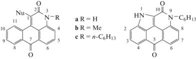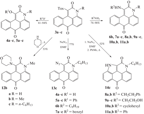 Большинство 1-замещенных 3Н-нафто[1,2,3-de]хинолин-2,7-дионов образуются при комнатной температуре. Реакция сульфона 3с с NaN3 заканчивается через час при пониженной температуре (0–5°C) с образованием азида 13с, который при нагревании в толуоле превращается в 9-гексил-1,9-дигидробензо[3, 4]изоиндоло[1,7,6-cde]хинолин-5,10-дион 14с (схема 3). В то время как замещение хлора, нитро- или сульфогруппы, как правило, требует нагревания [20–22, 25] (схема 1). Несколько труднее, при нагревании, протекает реакция соединений 3a–c с анилином, морфолином и фенолом (схема 3). Строение всех синтезированных соединений подтверждено данными элементного анализа, ИК- и ЯМР-спектроскопии (табл. 2, 3).