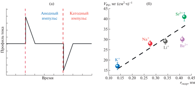 Характер переменного импульсного тока, используемого для диспергирования (а), и зависимость скорости накопления продуктов электрохимического диспергирования Pd от радиуса гидратированного катиона электролита (б).