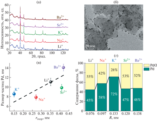 Рентгенофазовый анализ полученных катализаторов показал, что палладий в них представлен двумя различными фазами – Pd и PdO (рис. 2а). Структурные характеристики фаз представлены в табл. 1. Параметры решетки для Pd и PdO соответствуют гранецентрированной кубической ячейке (Fm3m) палладия и тетрагональной ячейке (P42/mmc) оксида палладия. Соотношения размеров D111 и D200 для Pd, D100 и D002 для PdO позволяют предположить, что частицы имеют симметричную, близкую к сферической форму и равномерно распределены по поверхности углеродного носителя, что также хорошо видно на ПЭМВР-изображении (рис. 2б). Размеры частиц PdO не зависят от состава электролита при синтезе и составляют для всех полученных материалов 1.9 ± ± 0.2 нм. В противоположность им размеры частиц Pd возрастают с ростом радиуса гидратированного катиона от 7.9 для K+ до 14.2 нм для Ва2+ (рис. 2в). На основании имеющихся данных трудно предположить характер взаимодействия обеих фаз (отдельные частицы Pd и PdO или частицы со структурой ядро/оболочка). С ростом радиуса однозарядных катионов электролита содержание наночастиц палладия возрастает с 45 до 72% для Li+ и K+ соответственно. В присутствии двухзарядных катионов Sr2+ или Ba2+ содержание фаз практически одинаково вне зависимости от радиуса иона (рис. 2г).