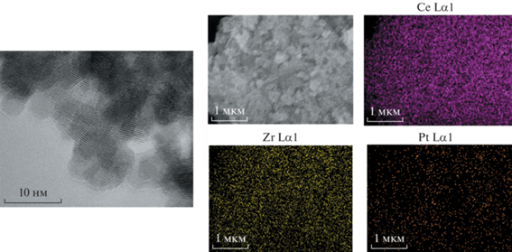 Исследования катализатора 1%Pt/CeO2–ZrO2 методами просвечивающей электронной микроскопии (ПЭМ) и сканирующей электронной микроскопии с элементным анализом (СЭМ-ЭДС) (рис. 1) показали равномерное распределение элементов по поверхности катализатора, при этом на микрофотографиях ПЭМ не удалось идентифицировать наночастицы платины вследствие их малого размера, а также плохого Z-контраста с носителем из-за близости атомных весов элементов Pt и Ce. Частицы носителя характеризуются наличием дефектов в кристаллической решетке, а их размер не превышает 10 нм, что согласуется с ранее полученными данными РФА (табл. 1) [19].