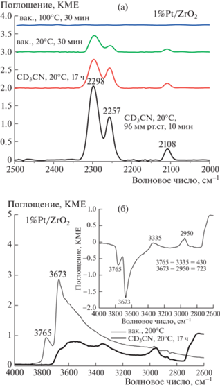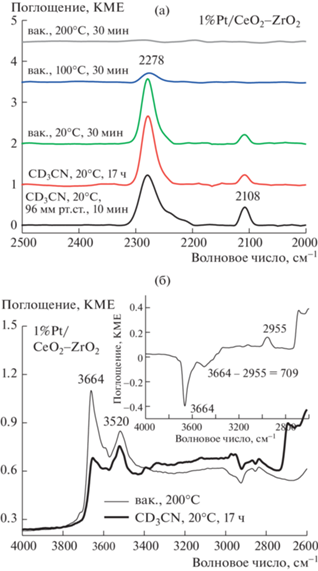 При адсорбции СD3CN в спектре образца 1%Pt/CeO2–ZrO2 появляются две полосы при 2278 и 2108 см–1 (рис. 4а). Полоса при 2278 см–1 соответствует валентным колебаниям связи С≡N в молекуле ацетонитрила, адсорбированного на БКЦ. Полоса при 2108 см–1 относится к деформационным колебаниям C–D-связи в CD3-группе. В спектре в области колебаний ОН-групп, зарегистрированном после вакуумной обработки, присутствуют две полосы (рис. 4б). Полоса с максимумом 3664 см–1 и протяженным “хвостом” соответствует колебаниям мостиковых ОН-групп на катионах Ce3+ ((Ce3+)2–OH) и Ce4+ ((Ce4+)2–OH и (Ce4+)3–OH) [27, 30], а полоса при 3520 см-1 соответствует колебаниям возмущенных водородной связью ОН-групп. В результате длительной выдержки после адсорбции CD3CN полоса при 3664 см–1 исчезает из спектра, и появляется (видно на вставке) полоса при 2955 см–1, следовательно, сдвиг полосы составляет 709 см–1.