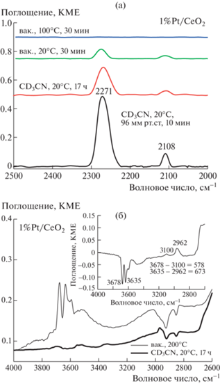 При адсорбции дейтерированного ацетонитрила в спектре образца 1%Pt/CeO2 появляются две полосы при 2271 и 2108 см–1 (рис. 3а). Полоса при 2271 см–1 характеризует валентные колебания связи С≡N в молекуле ацетонитрила, адсорбированного на БКЦ. Полоса при 2108 см–1 принадлежит деформационным колебаниям C–D-связи в CD3-группе. Сдвиг полосы, соответствующей колебаниям связи С≡N в молекулах ацетонитрила, адсорбированных на БКЦ, составляет 18 см–1 по сравнению с частотой в газовой фазе (2253 см–1). Ацетонитрил-d3 полностью десорбируется при 100оС. В спектре в области колебаний ОН-групп, зарегистрированном после вакуумной обработки, присутствуют две полосы. Полоса при 3678 см–1 соответствует мостиковым ОН-группам на катионах Ce3+ ((Ce3+)2–OH), а полоса при 3635 см–1 соответствует двойным и тройным мостиковым ОН-группам на катионах Ce4+ ((Ce4+)2–OH и (Ce4+)3–OH соответственно) [27, 30].