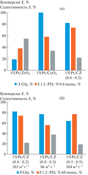 Влияние морфологических характеристик и состава носителя на активность и селективность катализатора 1%Pt/СеO2–ZrO2 показано на рис. 5б. Уменьшение удельной площади поверхности носителя приводит к небольшому снижению конверсии глицерина, а также к падению селективности по 1,2-PD с 74 до 58% и увеличению выхода легких спиртов. Такое влияние площади поверхности носителя на селективность катализатора говорит о том, что носитель действительно принимает участие в реакции и на нем имеются активные центры для адсорбции и активации субстрата. Вследствие уменьшения площади поверхности носителя снижается число активных центров на нем. В результате образующиеся в реакции промежуточные продукты дольше находятся на поверхности катализатора и успевают вступать в реакцию гидрогенолиза и более глубокого гидрирования с образованием моно-спиртов. Увеличение содержания циркония в составе носителя приводит к снижению конверсии глицерина на катализаторе 1%Pt/СеO2–ZrO2 (Ce : Zr = = 0.5 : 0.5) с удельной поверхностью АBET = 104 м2 г–1, однако селективность по 1,2-PD и моно-спиртам не изменяется по сравнению с образцом 1%Pt/СеO2–ZrO2 (Ce : Zr = 0.8 : 0.2), характеризующимся меньшим содержанием Zr в составе носителя.