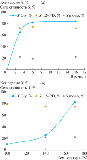 Зависимость конверсии глицерина и селективности катализаторов от времени реакции (а) и температуры реакции (б). Условия реакции: m(Gly) = = 60 мг, m(кат.) = 64 мг, H2O 2 мл.