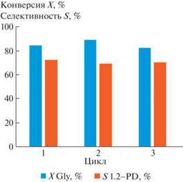 Катализатор 1%Pt/СеO2–ZrO2 (1%Pt/CZ) проявил высокую активность и селективность по 1,2-PD, достигающую 74% при конверсии глицерина 82% за 6 ч.