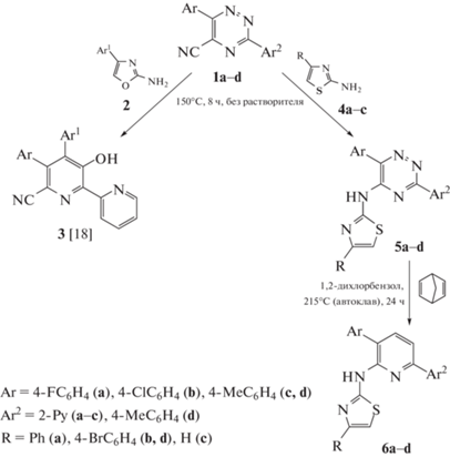 С помощью колоночной хроматографии из реакционной массы были выделены соединения 5, которые, согласно данным масс-спектрометрии, соответствовали ожидаемым продуктам замещения цианогруппы на фрагмент аминотиазола. Выделение продуктов 5 в индивидуальном виде в данном случае было весьма затруднено, и они были направлены без дополнительной очистки на последующую реакцию аза-Дильса–Альдера с 2,5-норборнадиеном. Процесс проводили при 215°С в среде 1,2-дихлорбензола с использованием автоклава, что ранее успешно было применено для схожих триазинов [21, 22], в частности, с остатком 4‑аминопиразола [23]. При помощи колоночной хроматографии (би)пиридины 6 были выделены в чистом виде. Их структура была подтверждена данными спектроскопии 1Н ЯМР, масс-спектрометрии и элементного анализа. Так, в спектрах 1Н ЯМР зарегистрированы сигналы протонов 2‑пиридильного заместителя (для соединений 6а–с), нового пиридинового кольца в виде двух дублетов, а также ароматических заместителей в (би)пиридиновом и тиазольном фрагментах. Отдельно следует отметить для соединений 6а,b,d наличие синглета протона тиазольного цикла (7.02–7.08 м. д.), а в случае соединения 6с – дублета одного из протонов тиазола (6.87 м. д.). То есть, 2-аминотиазолы могут быть успешно использованы в стратегии получения замещенных (би)пиридинов в результате последовательных реакций ${\text{S}}_{{\text{N}}}^{{\text{H}}}{\text{/S}}{{_{{\text{N}}}^{{ipso}}}^{{}}}$ в ряду 1,2,4-триазинов и аза-Дильса–Альдера [24].