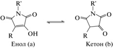 Гидроксималеимиды и пирролидин-2,3,5-трионы являются важными синтетическими промежуточными соединениями [1–3], которые также обладают слабой антибактериальной и противогрибковой активностью [4–6] или могут служить ингибиторами оксидазы гликолевой кислоты [7]. Была описана реакция с N-нуклеофилами, а также замена гидроксильной группы на атом хлора под действием оксалилхлорида [8–10]. Однако структура таких производных до сих пор не была исследована достаточно тщательно. Например, 3-гидроксималеимид (3-кетосукцинимид) может существовать в виде четырех таутомерных форм: енола 1a, кетона 1b и двух иминолов 1c,d (рис. 1).