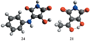 Оптимизированные структуры производных 3-гидроксималеимида: 3‑гидрокси-4-(фениламино)-малеимида 24 и 3-ацетил-4-гидроксималеимида 21.