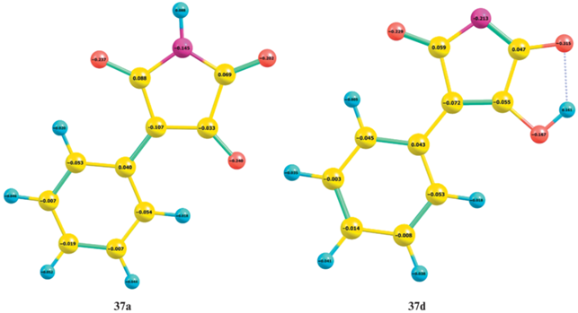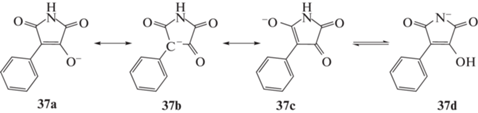 Известно, что 3-гидроксималеимид образует соли, например, с аминами [10], и возможны по меньшей мере две различные формы – с отрицательно заряженным кислородом или азотом. Рассчитаны энергии различных структур аниона 3-(гидрокси)-4-фенилмалеимида 37 (рис. 5).