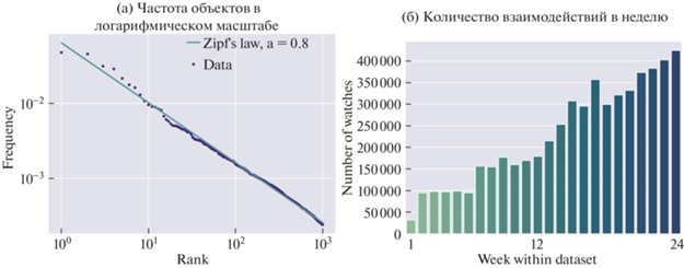 Наборы данных, основанные на взаимодействиях пользователей с фильмами, обычно имеют распределение просмотров по степенному закону, при котором несколько объектов доминируют в предпочтениях пользователей [20]. Рисунок 1a иллюстрирует этот факт для набора данных Kion, показывая частоты объектов в логарифмическом масштабе. Как показывает рисунок, данные можно довольно хорошо аппроксимировать распределением по закону Ципфа с параметром степени $\alpha = 0.8$.